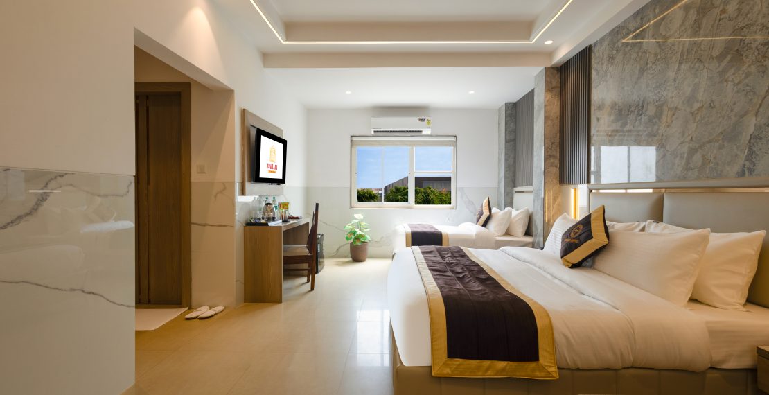 Experience the refined charm of Dahabi Family Suite near Delhi IGI Airport and Aerocity. Each room blends modern design with elegant comfort. Enjoy a plush queen-size bed, stylish décor, and soothing lighting that invite relaxation. Refresh in the spacious en-suite bathroom with premium amenities. A dedicated workspace makes every stay ideal for business and leisure travelers alike. Discover true sophistication and warm hospitality at Dahabi Venue, where comfort meets convenience.